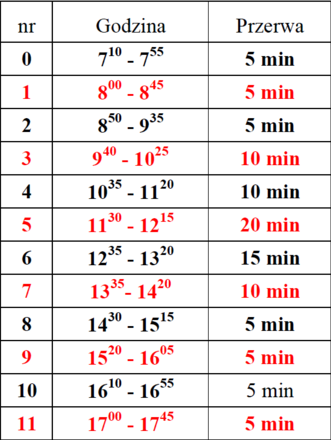 GODZINY TRWANIA ZAJĘĆ LEKCYJNYCH